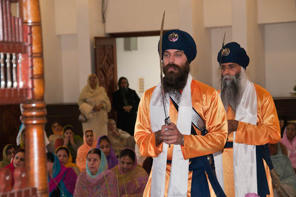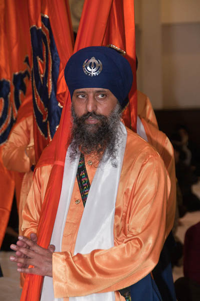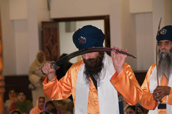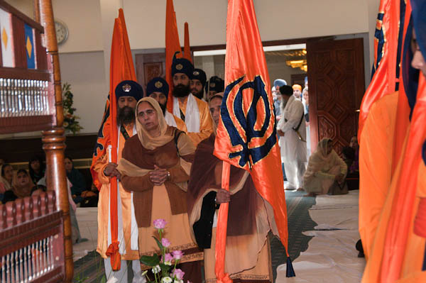 Then walks round behind the canopied throne for the Guru Granth Sahib