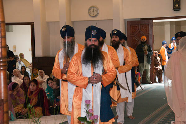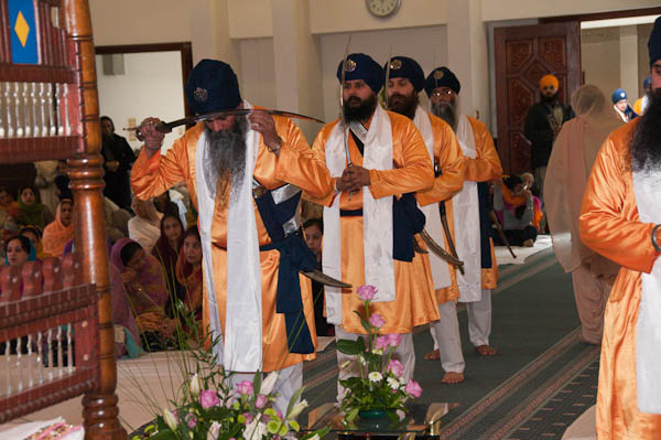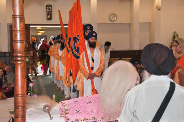 The Panj Pyare stand behind the Guru Granth Sahib during the worship