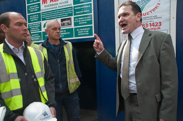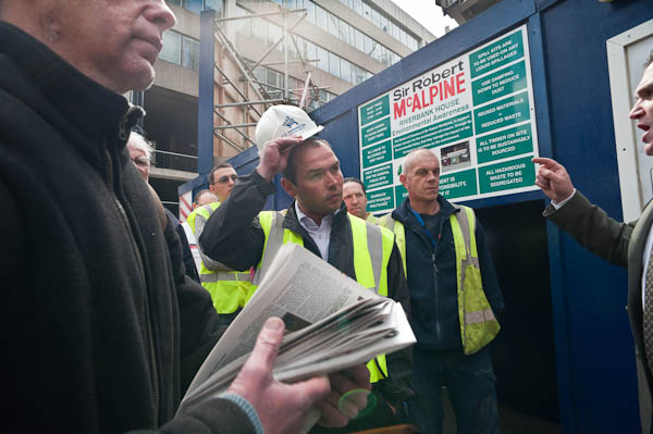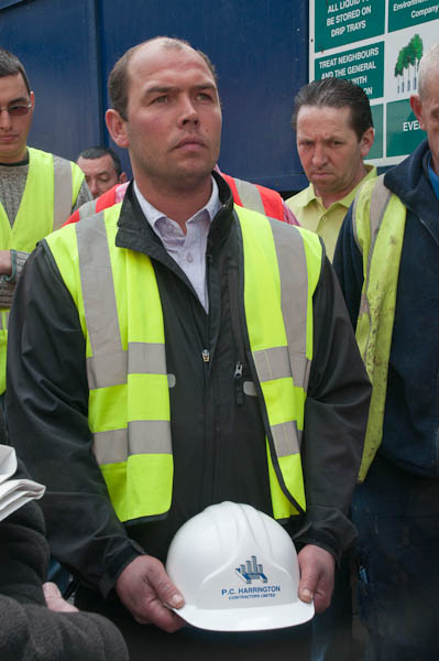 ![]() Building workers removed their hard hats outsdie Riverbank House ![]() and after a short address held a silence for Richard Chaddock who died here on March 19 this year. ![]() ![]() ![]() |