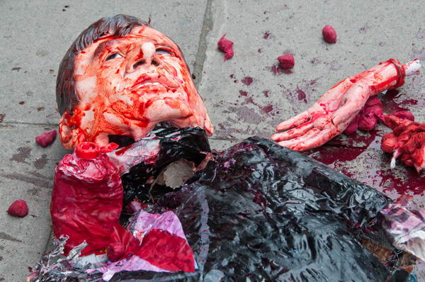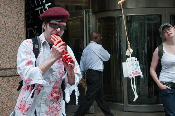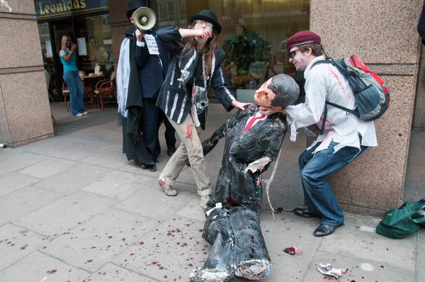 Biting Brown's hand - and a Labour Party skeleton hands outside the office door