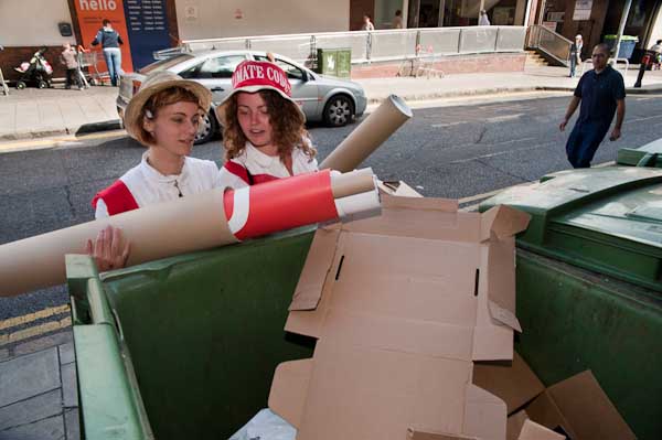 Scavenging for materials for the workshops from some bins - lots of good clean cardboard