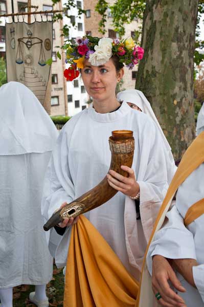 and given to one of her assistants to carry while she holds a basket of flowers and fruit