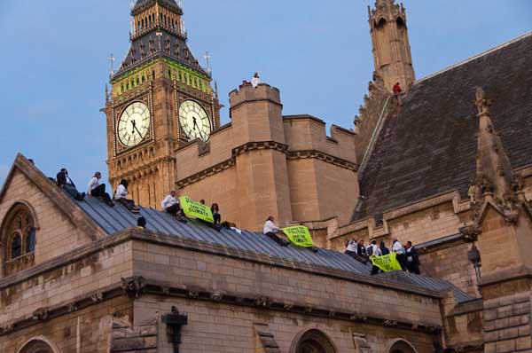 one cornerDisplaying bright yellow banners with the message 'CHANGE THE POLITICS SAVE THE CLIMATE’ the Greenpeace demonstrators called on the UK Government to take effective measures to combat climate change, including stopping airport expansion, a refocus of taxes on pollution, fair financing to help pay for low carbon development in poorer countries, an increase in government and private investment in alternative energy and a switch towards renewable energy and an upgraded grid.