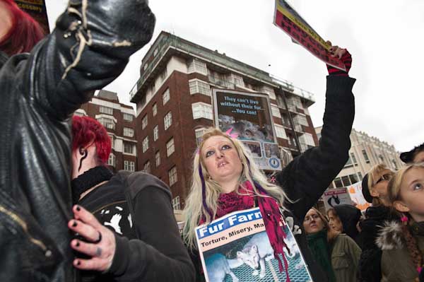 Among the shops on the route of the march were Fendi, Gucci and Armani, Escada, Joseph, and Harrods, the only department store in the UK that still sells fur.