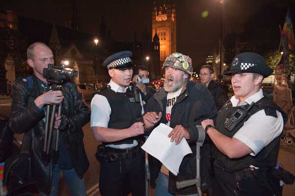 Police tonight arrested peace protester Brian Haw who has been carrying out a permanent protest in Parliament Square opposite the Houses of Parliament since 2 June 2001, 3072 days ago. After a lengthy argument, Mr Haw, who now walks on crutches, was walked away by two officers, pushed still protesting into the back of a police van and driven away.