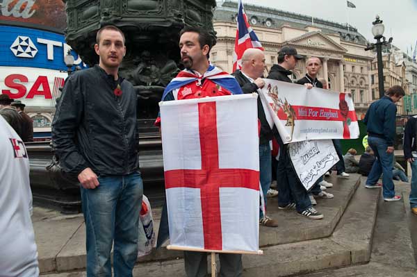 Although the organisers of the MARCH4SHARIAH had issued a press release the previous day announcing the cancellation of their proposed march "unique march in Central London which aimed to highlight the superiority of the Shari’ah over that of British democracy and man-made law", two groups of demonstrators still turned up at Piccadilly Cricus on Saturday to show their opposition.