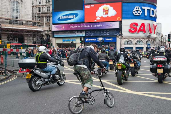 On Saturday afternoon a large fleet of motorbikes toured Central London on their way to a protest meeting outside Westminster council offices near Victoria Station. It was hard to know quite how many, but my guess would be that there were perhaps a thousand riders. One of the leading bikes carried a tall banner reading 'No to the Bike Parking tax' and many of the riders wore fluorescent tabards with the same message on the back.