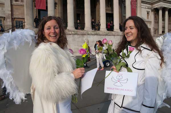 I'm not sure which of the Angels of Love, Compassion, Wisdom, Patience, Courage, Happines or Harmony who gave me a hug and a small message of love, a picture of an angel on the reverse of which was written "I purify my mnind by affirming my worth and honouring my choices for love." Unfortunately it didn't have a desirable effect on my own soul mate when I hugged her on arriving home and handed it over. Probably I should have taken the flower I was offered in its place, or perhaps she is just a hard case. Most of those who I saw stopped in Traflagar Square seemed ot be amused and intrigued, though there were some who turned away to avoid the angels and archangels.