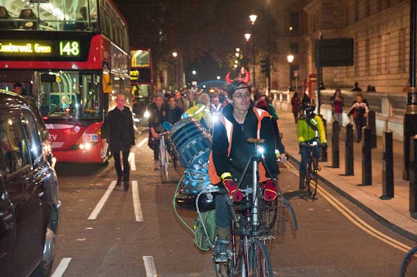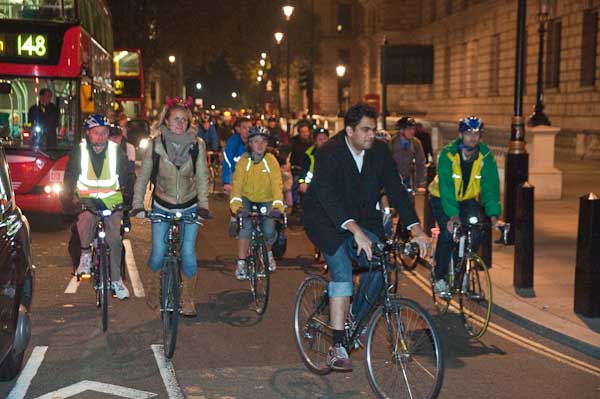 Cyclists stop traffic to allow the Mass to go round Parliament Square