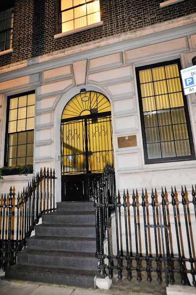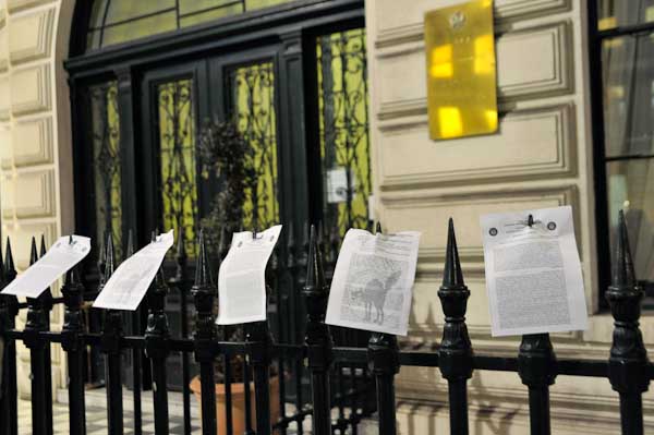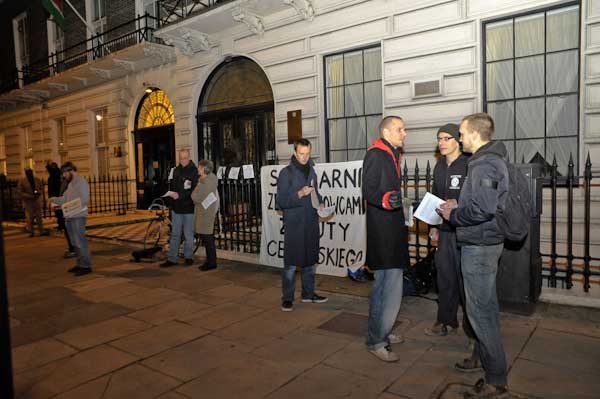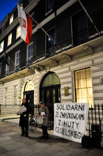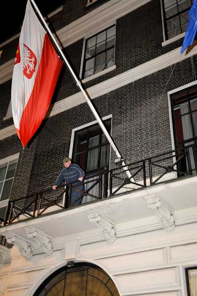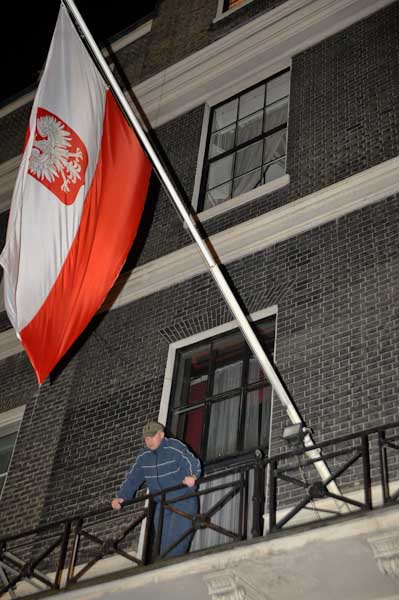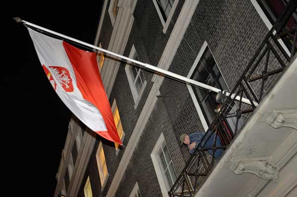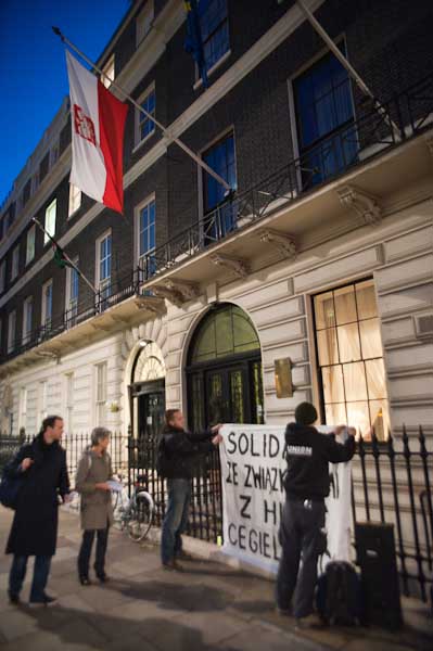Putting the banner on the Polish Embassy railings in Portland Place, London