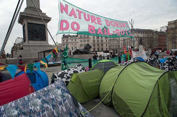 Sharing the square with the camp were the usual Christmas tree and crib, but the sqaure was really dominated by the Climate Camp banner strung between two giant tripos, 'NATURE DOESN'T DO BAIL-OUTS'. But the Climate Camp was offering free cups of tea.