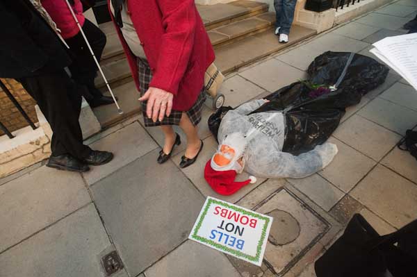 After singing all three verses and choruses of this, they went on to other anti-nuclear carols for around 15 minutes, while one of the protesters with a Santa mask and a 'weapons inspector' white suit lay on the pavement in a black plastic body bag.