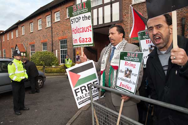 Around a hundred demonstrators turned up early outside the hotel in Hendon where ex-Israeli Foreign Minister Tzipi Livni was scheduled to speak to the Jewish National Fund to protest against her involvement in the Israeli assault on Gaza which began almost a year ago, and to call for an intensified boycott of Israeli goods and a free Palestine.