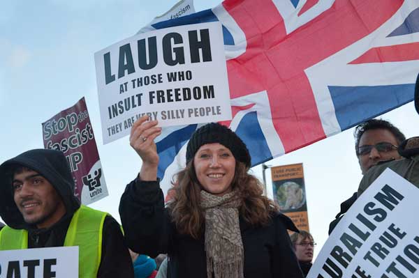 The SIOE goes to great pains to deny it is a racist organisation, but works together with groups such as the EDL, and at previous demonstrations there have been clearly racist chants as well as Nazi salutes. Here the protesters mainly seemed too despondent to indulge in any organised chanting and I saw no salutes, though one or two made rude gestures at the press photographers who outnumbered them fairly massively. One protester however was holding up a crude A4 poster depicting a woman in a burkha which could be thought offensive.