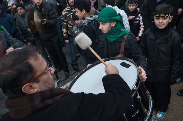 Around two thousand men and women marched in separate blocks in the procession from Marble Arch to the Islamic Centre in Holland Park, accompanied by the beating of drums and the sounding of a trumpet. Most of those taking part were dressed in black for the solemn event, but some carried green flags and coloured banners, a few wore white tunics. As they walked many beat their hands against their chests as a symbol of their mourning, and some were weeping for the Imam Hussain and the martyrs of Karbala.