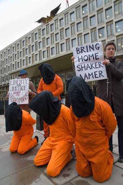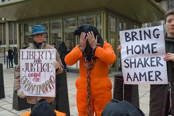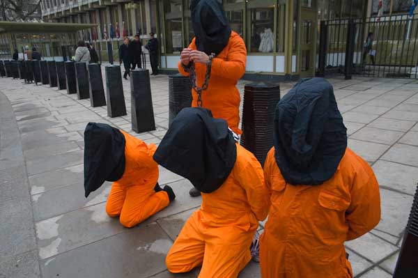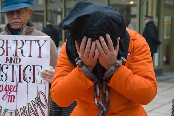 Black hoods and orange jumpsuits in Guantanamo vigil at US Embassy