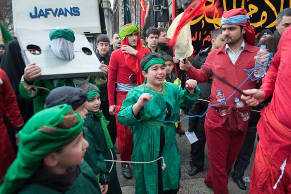 More than five thousand Shia Muslims came to Marble Arch today, Sunday 7 Feb 2010, for the 29th annual Arbaeen procession in London, commemorating the sacrifice made by the grandson of Mohammed, Imam Husain, killed with his family and companions at Kerbala in 680AD. After prayers and speeches they paraded along Park Lane in a ceremony of mourning.