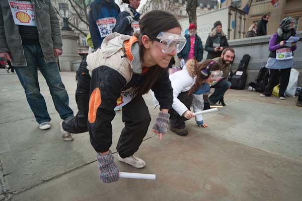 Trafalgar Square was officially hosting an event celebrating the 2010 Winter Olympics taking place now in Canada, and there was a giant screen showing ski jumping there, along with an ice-sculpture of the Olympic rings. But at one side of the square, next to Canada House, protesters put up banners and held a series of events - a tug-of-war, a curling event and a relay race for oil.