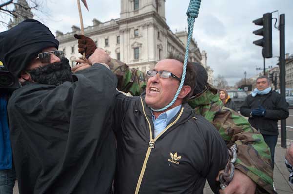 The demonstrations last January which involved many thousands of people and some of the most aggressive policing yet seen in the capital, including an incident in which police attacked a group of demonstrators in an underpass at Hyde Park, along with the use of controversial "kettling" of large groups of people who were held for a number of hours. Few arrests were made at the time, but later there were a number of dawn raids after police had spent some time examining the CCTV footage. These led to the arrest of around 90 young men, all Muslim and mainly of working class origin.