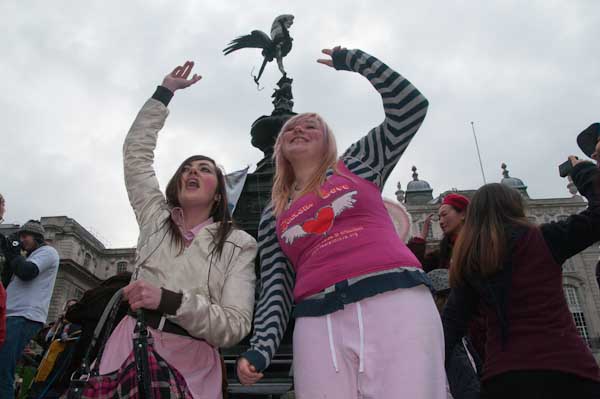 The first celebration was held only here around Eros but this year, when London had it's seventh annual Reclaim Love pavement party, there were also events elsewhere in England, in Ireland, Scotland, Wales, Pakistan, India, Spain, Italy, Germany, Austria, Iceland, France, Brazil, Argentina, New Zealand, the USA, Canada and Australia - a total of 40 locations around the world, including surfers who were celebrating in the ocean off Perth, Australia.