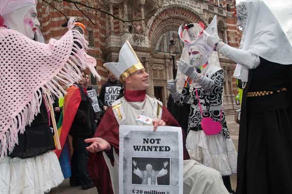 The demonstration, organised by Central London Humanists along with the British Humanist Association, the Rationalist Association, One Law for All, the National Secular Society and Outrage! included a figure dressed as the Pope and it was enlivened by three colourful Sisters of Perpetual Indulgence, who handed out mini-placards and small packets containing a condom and a mint sweet.