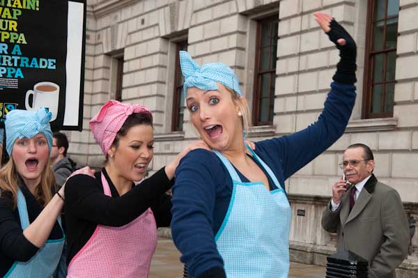 Fair Trade tea ladies in Parliament SquareOver 50 tea-ladies in blue and pink pinafores and head scarves came to Westminster this morning to urge everyone to switch to Fair Trade products, including tea, as a part of 'The Big Swap'. This was one of a whole series of events across the country in Fair Trade Fortnight, 22 Feb - 7 March and was organised by the Fairtrade Foundation. After demonstrating outside the Houses of Parliament they went up Whitehall to Trafalgar Square where they held a tea dance on the North Terrace.