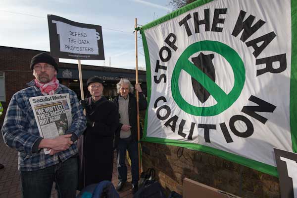 The picket was called at short notice by the Stop the War Coalition, Palestine Solidarity Campaign, British Muslim Initiative and the Campaign for Nuclear Disarmament. They wanted to protest at the way that the police and judiciary are using these cases as a way to criminalise protest and to intimidate those who exercise their rights.