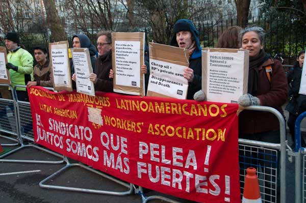 Around 15 protesters demonstrated noisily opposite the BP Headquarters offices on Friday afternoon in an emergency picket called by the Colombia Solidarity Campaign in supprort of workers at the BP processing plant at Tauramena in Casanare, Colombia. Members of the national Oil Workers Union (USO) have only been able to organise in BP plants since last year and started a strike for higher wages on 22 Jan 2010.
