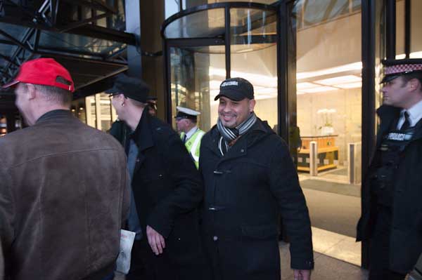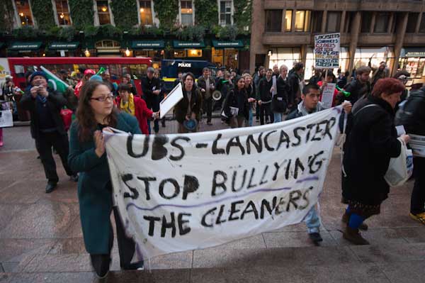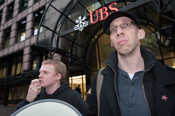 Protesters gather outside the United Bank of Switzerland in Liverpool St