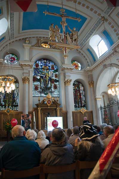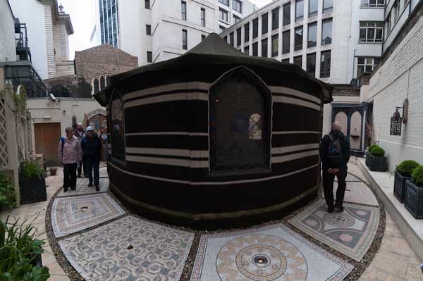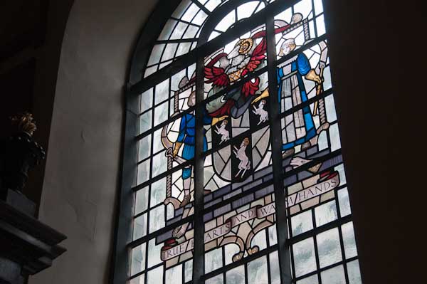 The Glover's window - "True Hearts and Warm Hands' and font with Adam and Eve at St Martins Ludgate
