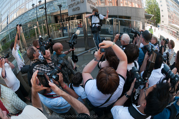 Jules Mattson, arrested a week earlier in Romford, photographs photographers at New Scotland Yard