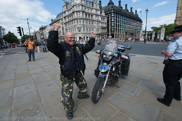 Sixty-nine year old Vladimir A Yarets from Minsk in Belarus, a remarkable man who had the dream of being the first deaf mute to travel around the world on a motorbike. came to Parliament Square today.