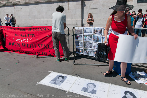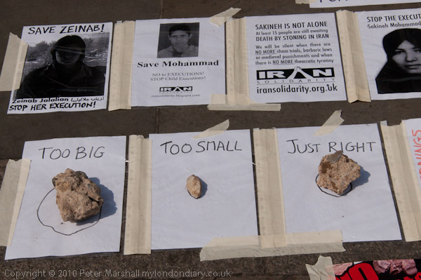 I called in briefly at Trafalgar Square where Iran Solidarity were planning to start a caravan through London against stoning in Iran, raising awareness against the case of Sakine Mohammadi Ashtiani, sentenced to death by stoning for alleged adultery, as well as the other prisoners in Iran who have been executed or are under threat of execution. The reaction around the world against this abhorrent sentence had already caused the Iranian government to announce she would not be stoned, and since Saturday they appear to have said she will not be executed, at least for the time being. If her execution goes ahead it will probably be by hanging, with a noose being put around the neck before she is pulled up carefully to die a slow death by strangulation.