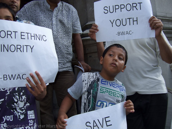 Some of the demonstrators held placards for the Bangladesh Welfare Association Croydon (BWAC) which a few months ago celebrated its 25th anniversary, but has now lost its £50,000 annual funding which among other things enabled to run an advice service using volunteers to give advice on employment, benefits and housing. Others were from the New Addington Women's Group, whose centre which has been running for 30 years will close, ending the Women's Health Group, play schemes and other activities.