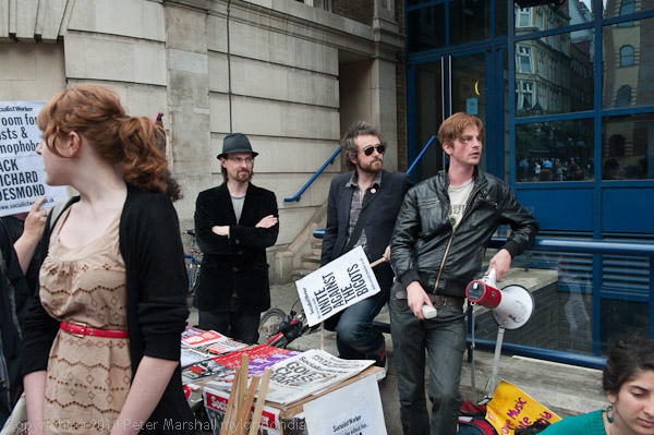 The crowd gathered with banners outside the offices on Southwark Bridge Road, spilling over from the pavement into the road. Present were many of those who actively campaign for freedom, human rights and justice in the capital.