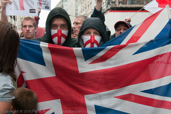From the start MFE insisted that they were not racist and that the England that they stood for was one that embraced all races. On their web site and Facebook pages they state in capitals: "WE ARE NOT A RACIST GROUP NOR DO WE CONDONE ANY RACISM, NOR ARE WE AFFILIATED WITH ANY RACIST GROUP. WE ARE ENGLISH AND PROUD - PROUD NOT RACIST." And although it is occasionally difficult to reconcile this with some of the shouting and chanting at the demonstrations, which have been attended by a wider range of people, it is a view which I think the MFE leaders hold sincerely. But clearly and very disappointingly they have allowed the movement to be diverted by too close an alliance with other groups and in particular the English Defence League (EDL) and certainly their Facebook group includes at least on prominent BNP member. It's a situation which they feel came to a head at this May's 'Patriots march' which they helped to organise, supplying the stewarding, but which was dominated by EDL members, and they now seem determined to separate themselves more clearly.