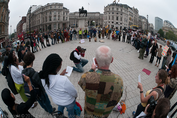 This Saturday they invited friends to participate in a Democracy Rally in Trafalgar Square, where I talked to them briefly around 12 noon. The main part of the square was in use for an event celebrating 50 years of independence for many African countries, and it was busy and filled with joyous but rather loud music, so the Democracy Villagers decided they to meet up around the equestrian statue of Charles II at the south end of the square and then march together around 1pm to a more suitable location for their event.