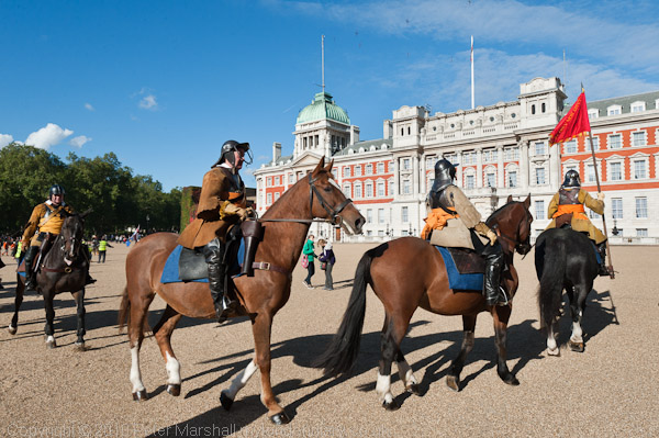 By now they had attracted quite an audience of tourists and a few others. But the onlookers were left behind as the group made a procession led by Knight beating a drum and a white rabbit, Flopsy Bunny along with Phoenix with a peace flag and Simon with a megaphone. Most of those present joined a procession that went through Admiralty Arch and along the Mall to St James Park.