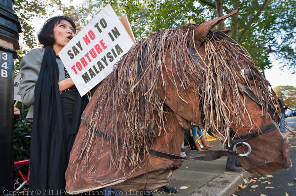 The UK chapter of the Malaysian Abolish ISA Movement (AIM) held a demonstration at the Malaysian High Commission calling for an end to torture and other human rights abuses in Malaysia. London, UK. 30/10/2010
