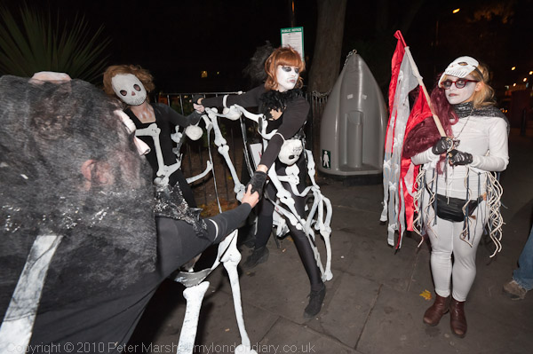 Later, after it had got dark there was a Halloween Dance of the Dead Street Parade starting from Hoxton Square, now one of the trendier areas of the city, making its way up to Dalston where there was to be a Halloween Party. By 7pm, there were several hundred people ready for the procession to start, including a group of dancers, the 'Corpse de Ballet' and a group from Strangeworks with some very well designed costumes, along with many others dressed up for the occasion.