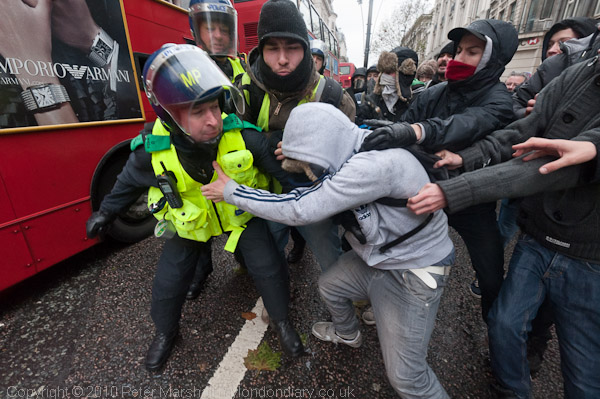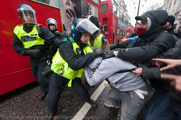 Back at Trafalgar Square, there is a good line of police across Whitehall, but people are walking through unchallenged