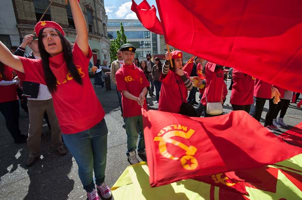Nov: Schoolgirls join hands in an attempt to protect a (possibly deliberately) abandoned police van from rioters