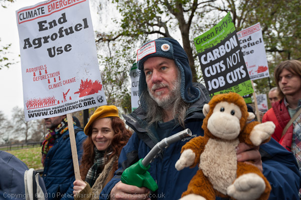 Dec: End Agrofuel Use - man with petrol hose and monkey on march