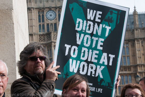 The Trade Union Co-ordinating Group (TUCG) which incluedes nine national unions (BFAWU, FBU, NAPO, NUJ, PCS, POA, RMT, UCU and URTU) called a Health and Safety Week of Action from 28th Feb to 5th March, and trade unionists together with other groups including Families Against Corporate Killers (FACK) came together to demonstrate outside parliament and lobby their MPs.