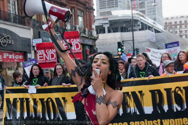 Women, and I'm sure most men also, are appalled at male violence against women, and the prevalence of domestic violence in this country. The march leaflet states that police receive on average a report of domestic violence every minute of the day, and that one woman in four will experience sexual assault as an adult. Many local authorities lack Rape Crisis Centres, and in particular specialised support services for ethnic minority women. There are 250 reported cases of forced marriage each year, around one case of so-called 'honour killing' a month and over 20,000 girls in the UK at risk of genital mutilation. Around 1400 women per year are thought to be trafficked into the UK for sexual exploitation each year, particularly from Eastern Europe.
