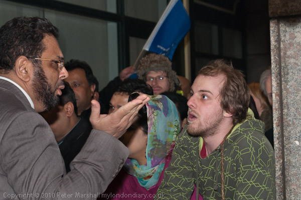 Some way down the street they stopped at a doorway protected by three police and surrounded them, saying that the police were being kettled and asking them how they liked being treated this way. There were no physical attacks on the police, although some of the teasing and shouting from protesters was fairly aggressive, but the mood changed when when one of the officers, who had been calling for reinforcements, drew his baton and began threatening people, and pushing them away.