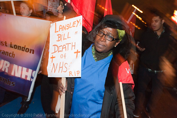 The park is also in the London Borough of Lambeth, which in 1984 under the leadership of Ted Knight was one of two councils to defy the Conservative governments order to cut services by refusing to set a budget - and which ended with him and the other councillors being required to pay a surcharge and being banned from holding any council office for five years. Knight was the final speaker at the rally before the start of the march, and when introduced got a great round of applause. Others speaking included several trade unionists, Lee Jasper of BARAC (Black Activists Rising Against Cuts), Chris Knight, dismissed by the University of East London for his political activities realted to the 2009 G20 protests, and Councillor Kingsley Adams, thrown out of the Labour group for opposing the cuts in Lambeth.