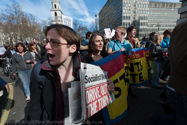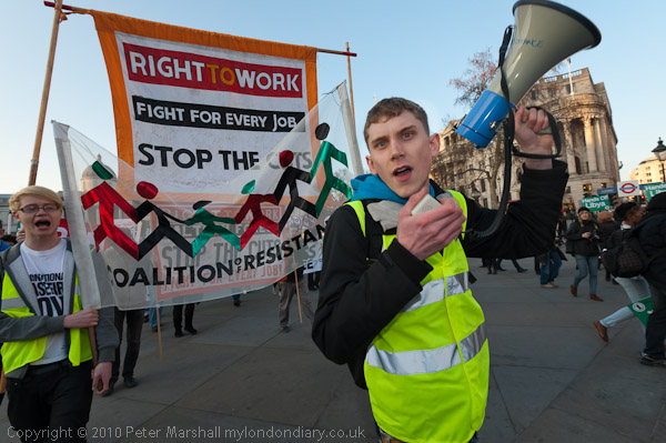 The Right to Work campaign planned several demonstrations on Budget Day against the cuts, including a march from Trafalgar Square to a rally at Downing St, organised together with the Coalition of Resistance and supported by Stop the War, Labour Representation Committee, CND & DPAC which also protested against the attacks on Libya.