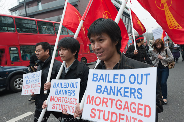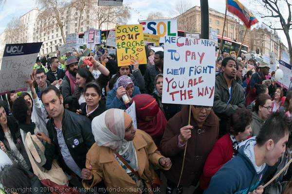 Many of the students spoke at the rally, saying how essential these courses were to them, offering them the chance to learn English and then get jobs - and pay taxes. Most were able to speak in English, proving the success of their courses, although a few needed the help of translators. Most too had learnt the essential English chants for marches against education cuts and put them to good use, with "No ifs, no buts, No education cuts!', 'Students and workers, Unite and fight!' and the rest sounding loud and clear towards Parliament and later at Downing St.