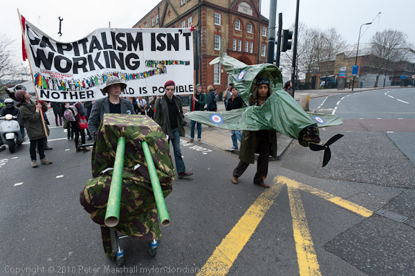 This was of course political theatre aimed at illustrating and promoting radical thought rather than a call to practical action, and the event at Bank also introduced the Four Horsemen of the Apocalypse to the British political scene - and they too were part of the procession that made its way from Camberwell to Kennington, led by the tank and Spitfire with a large banner behind them proclaiming 'Capitalism Isn't Working', based on a Tory poster about Labour with a long queue of the jobless, and with the tag line 'Another World is Possible.'